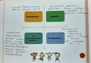 Подводя итоги, слушатели при рефлексии отметили следующее. Понравилось: деловое общение, разнообразие форм занятий, легкость и непринужденность общения в группе. Удивила: активность группы на занятиях, качество и объем работы педагогов дополнительного образования всей Новосибирской области. Особо отметили актуальность, доступность и содержательность материалов дистанционного модуля.